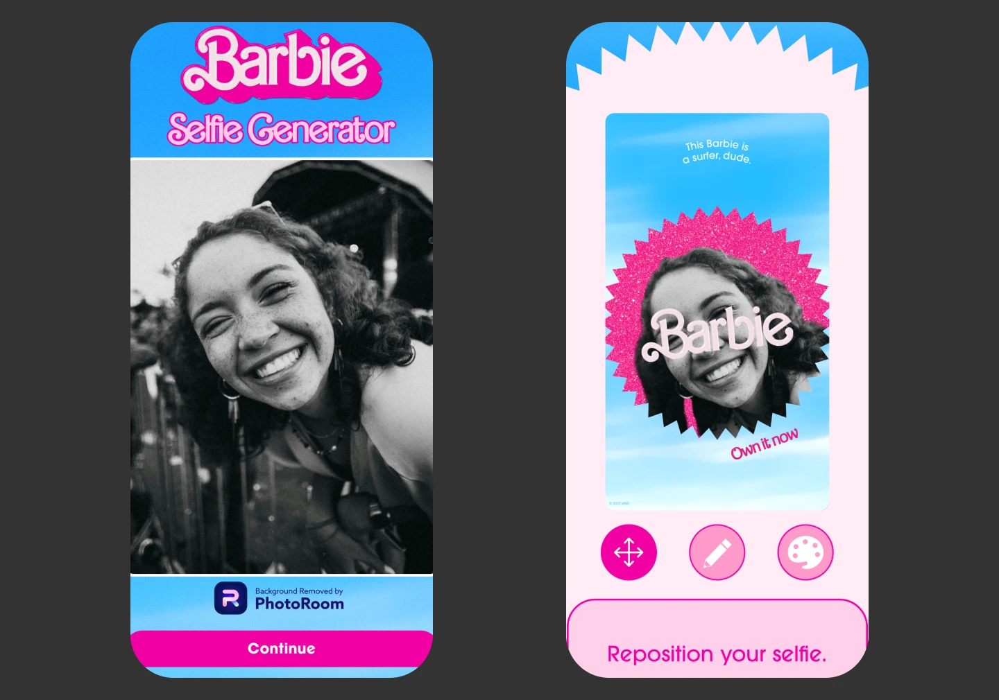 BarbieSelfie.ai was a web-based tool built for the Barbie the Movie marketing campaign in 2023, where users uploaded a selfie, Photoroom's API instantly removed the background, and the campaign's creative layer placed the clean cutout into a branded Barbie movie poster that could be shared directly to social media.